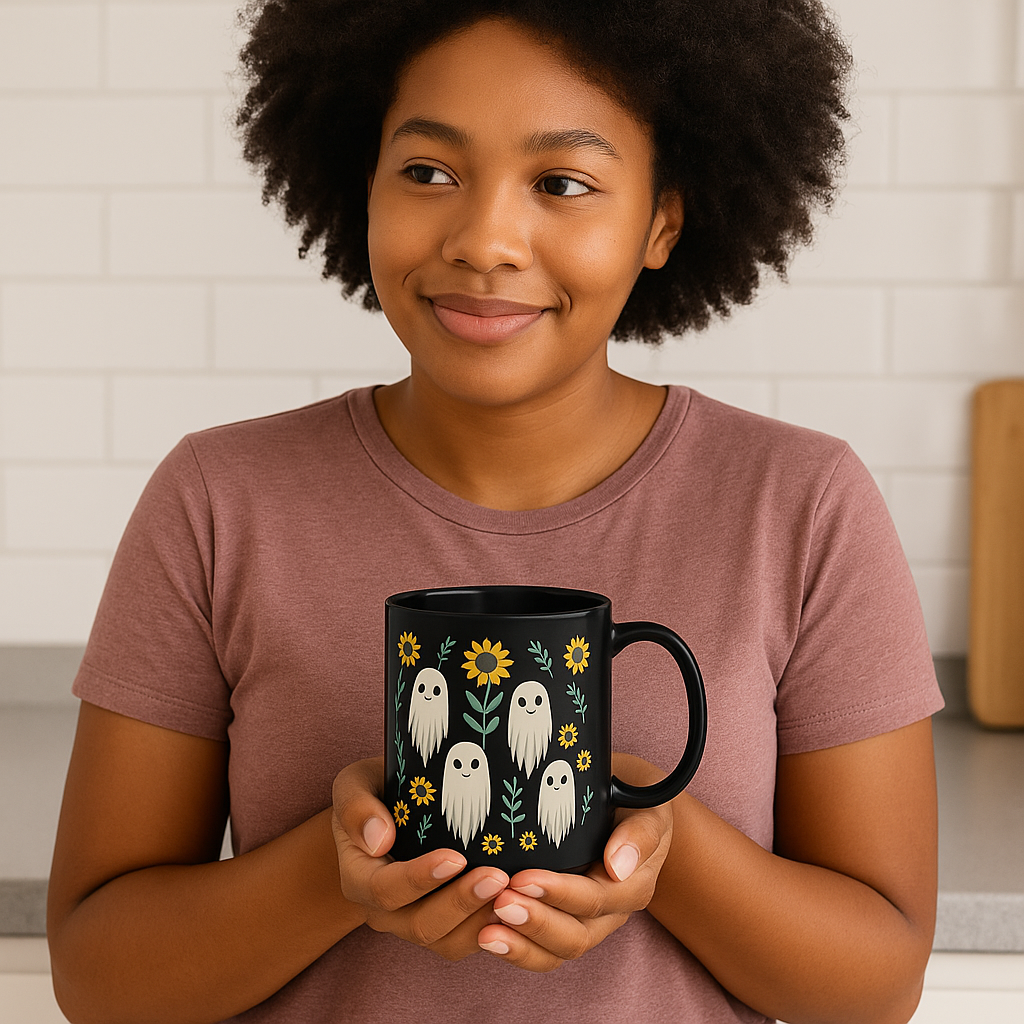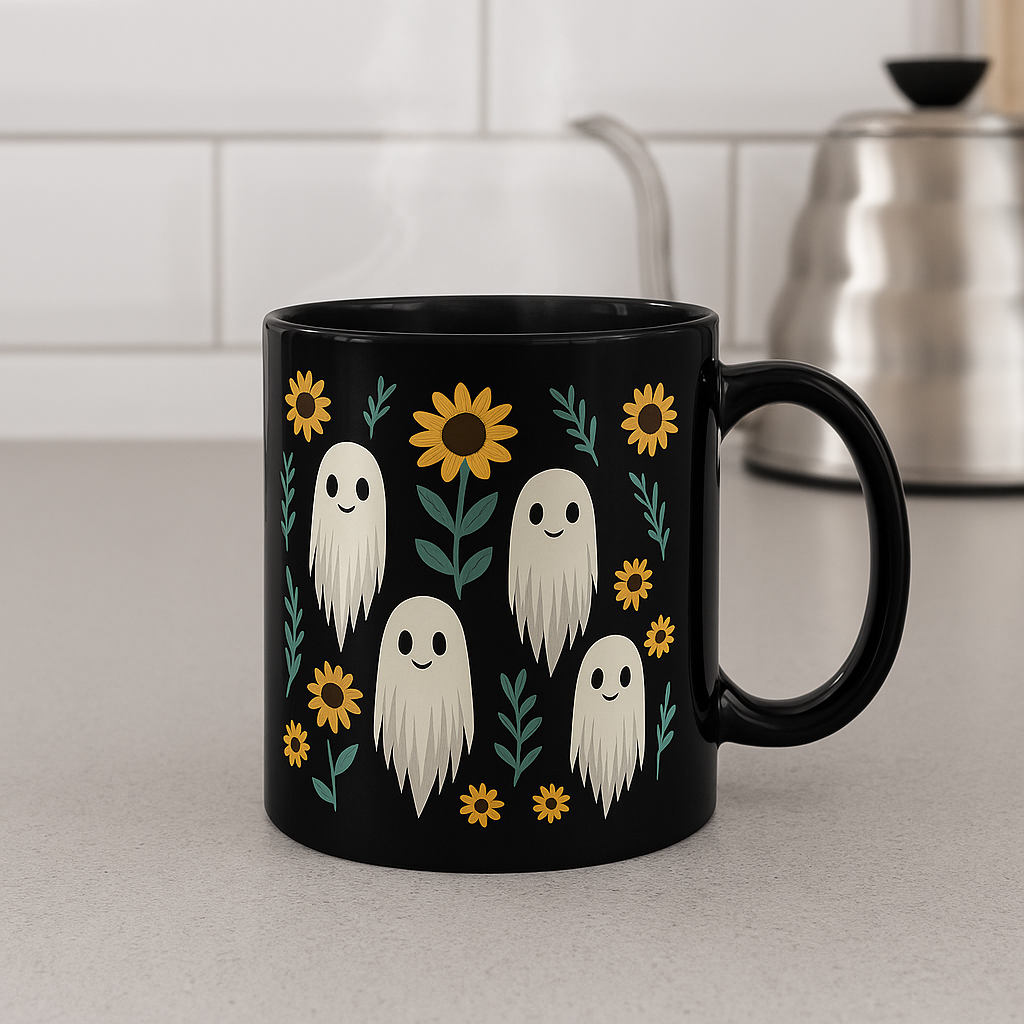 Start your mornings with a touch of cozy, spooky charm! This black ceramic mug features an adorable design of smiling white ghosts surrounded by golden sunflowers and lush greenery, making it the perfect blend of Halloween vibes and autumn farmhouse style.