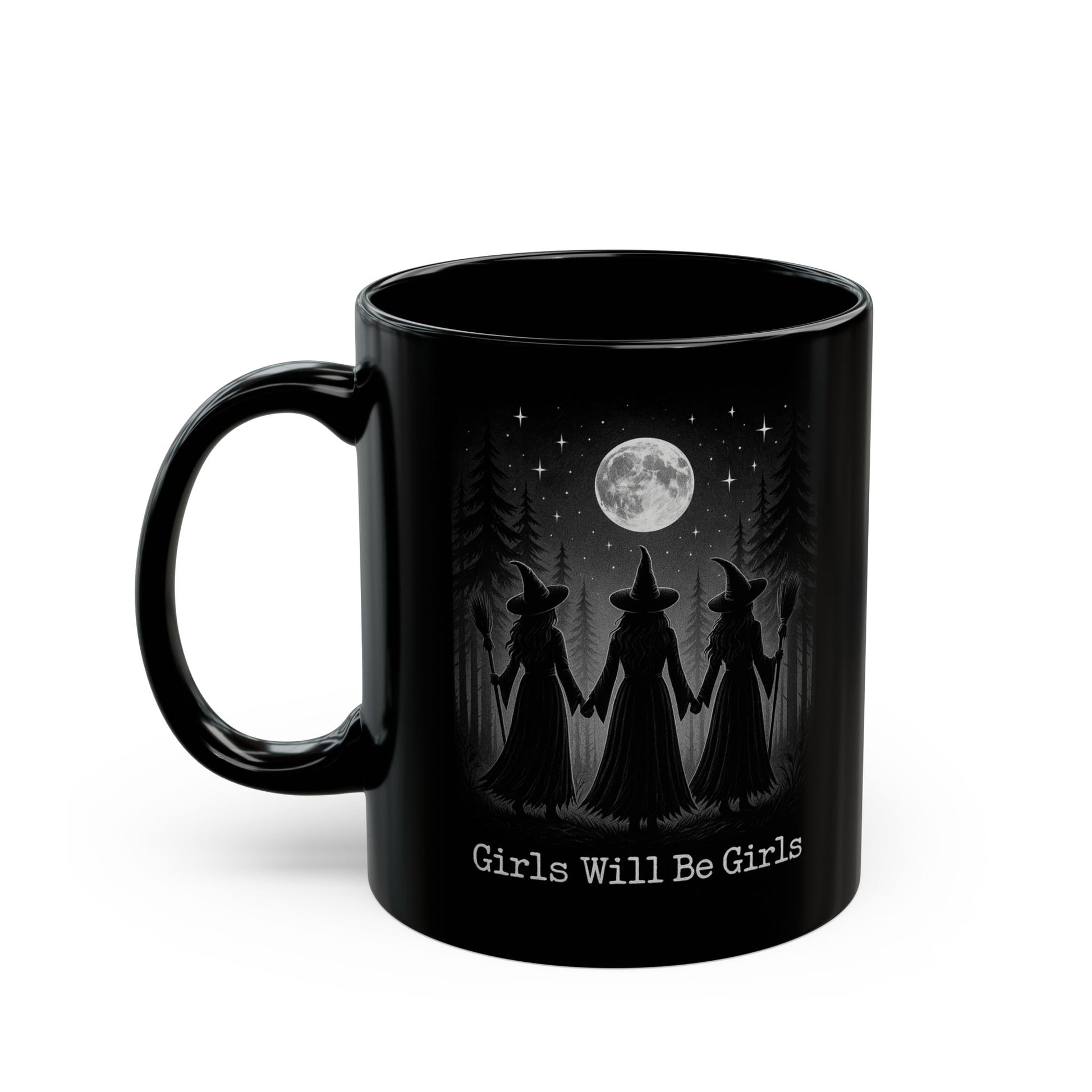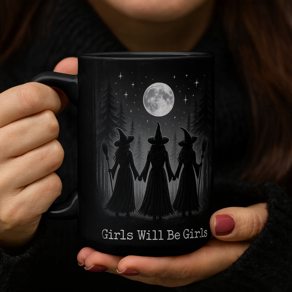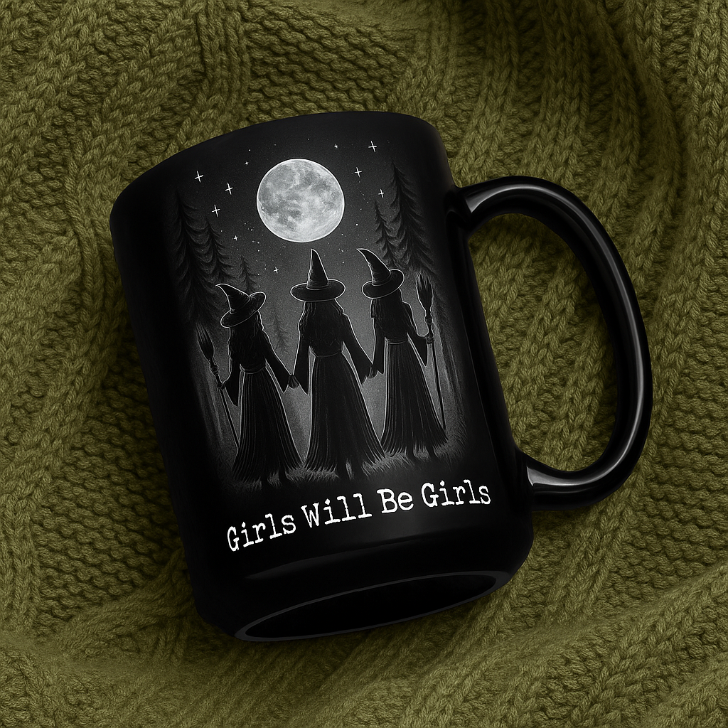 Bring a touch of magic to your morning routine with our “Girls Will Be Girls” Witch Mug. Featuring a hauntingly beautiful design of three witches standing beneath a full moon, this gothic-inspired coffee cup is the perfect blend of spooky and empowering.